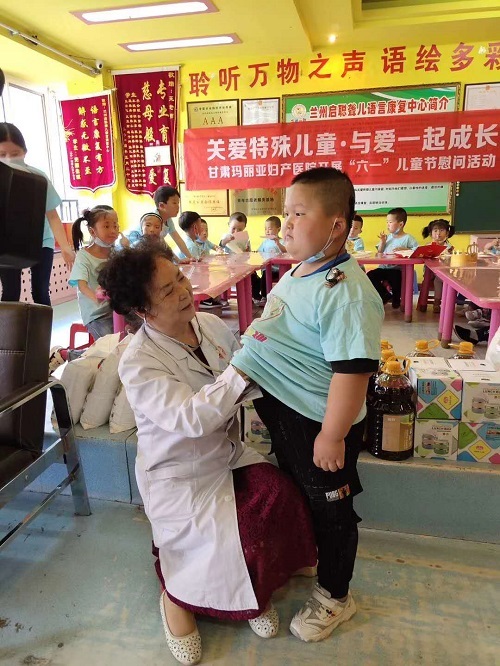 “关爱听障儿童,助力儿童健康成长。甘肃玛丽亚妇产医院的志愿者一行不仅为孩子们带来了零食、学习用品等六一礼物,还为启聪中心送来了米面油等生活物资。同时张瑞兰主任和孙淑娴主任还帮孩子们做了心肺检查,并教导孩子们注意日常卫生习惯,保持健康的身体。